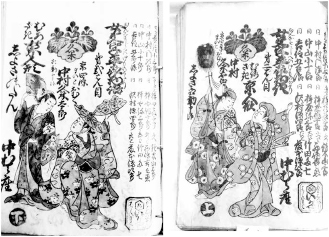ただし、そのままではありません。現在の《水仙丹前》は、《丹前》の〽忘るる暇もないわいな」と〽恋は様々」以下恋尽くしの歌詞の間に、《鎗踊》〽振れ振れ振り込めさ~花は九重」を挟んだ形になっています。そこで、いつこの形になったのかを確認したところ、冨士屋小十郎板の再版本以降、現在の歌詞に定着していることがわかりました。また、冨士屋小十郎の活動期間は、吉野雪子氏(国立音楽大学)の御教示により、天明四年(一七八〇)十一月以降であることが明らかとなりました。従って、現在の形はかなり古くから行われていたことになりますが、今回は初演の形に戻し、《丹前》と《鎗踊》をそれぞれ独立させて演奏します。
